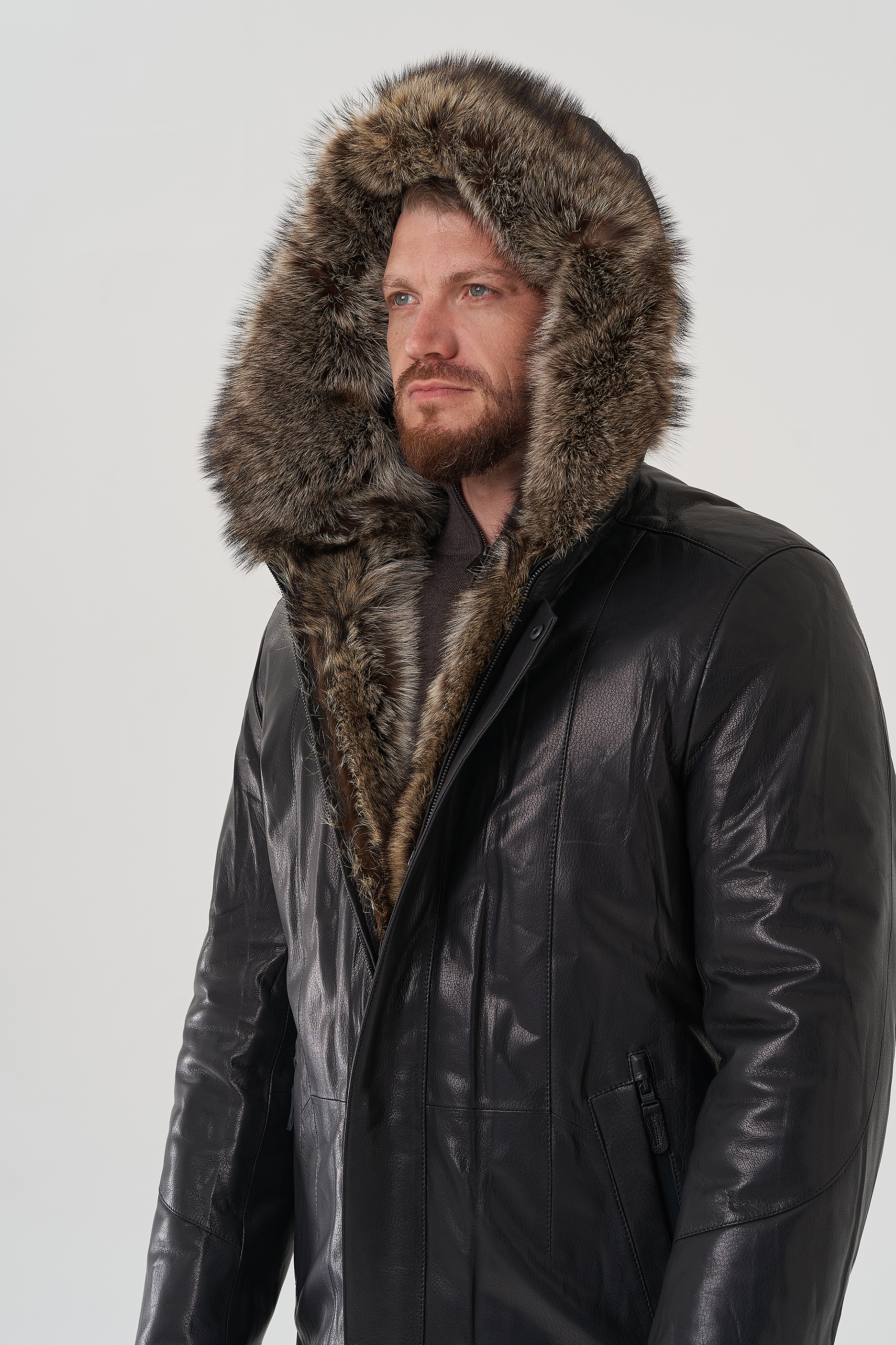 Крой воротника - капюшон, отделка - енот