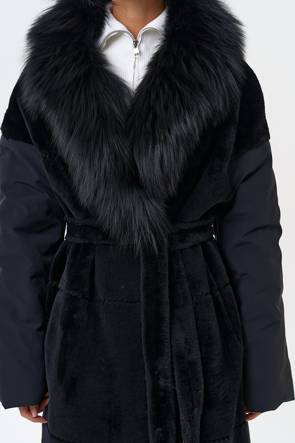Вид застежки - кнопки, пояс из меха овчины