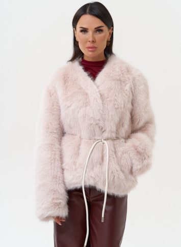 Фасон - прямой Длина изделия - 60 см Цвет - розовый (персиковый) Материал - экомех Состав полотна - полиэстер 100% Подкладка - полиэстер 100% Вид застежки -крючки, пояс Вид ворота - V-образный Фасон рукава - спущенное плечо, длинный |